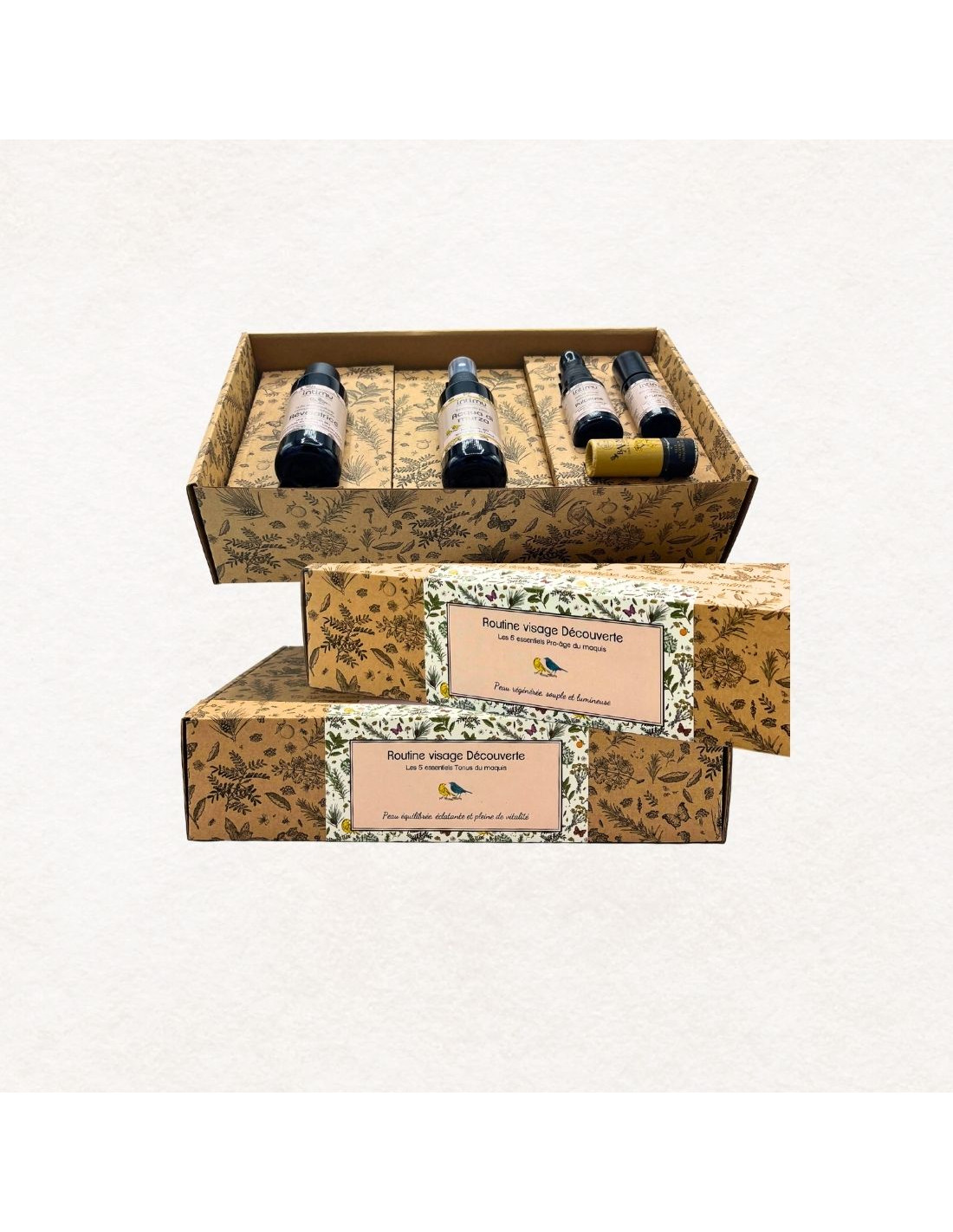 Ce coffret réunit cinq soins essentiels — Révélatrice, eau florale BIO d’immortelle, sérum Pulpeuse, contour des yeux Prunelle et baume à lèvres à l’immortelle — pour nettoyer, tonifier, régénérer et apporter confort et éclat au quotidien.