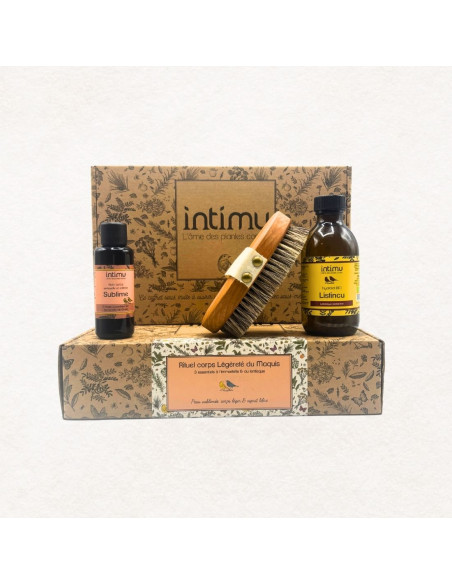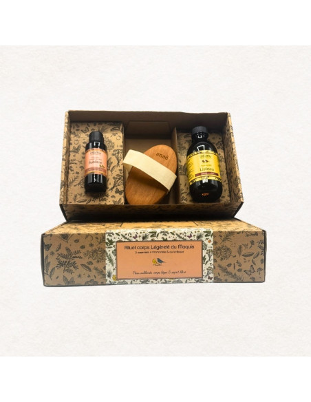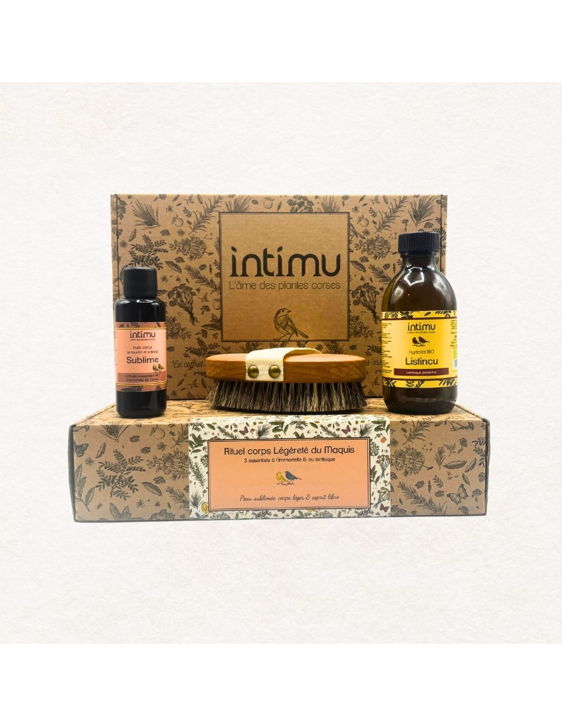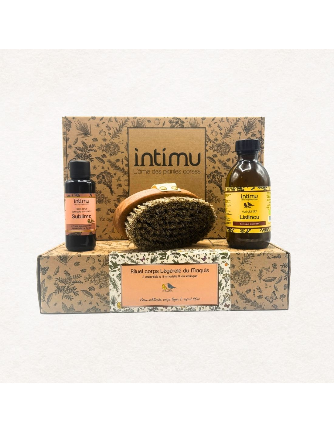 Composition : Huile corps Sublime 50ml, Hydrolat de lentisque pistachier 100 ml, Brosse de massage corps.