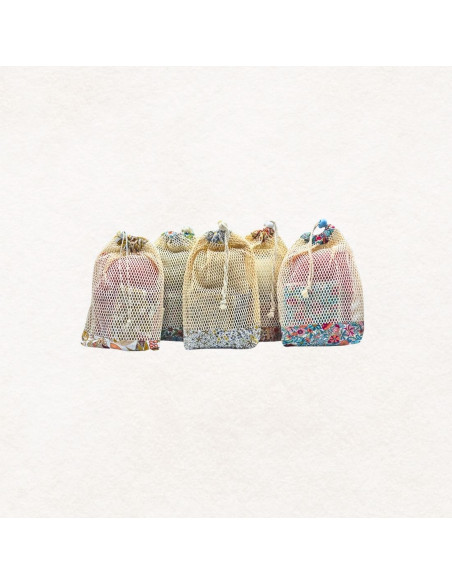 Tous les accessoires sont confectionnés à la main par Fanny, dans son atelier à Biguglia, avec des tissus premium sélectionnés spécialement pour Intimu : coton BIO, nid d’abeille aérien, Liberty délicat, et une éponge bouclette douce en coton biologique.