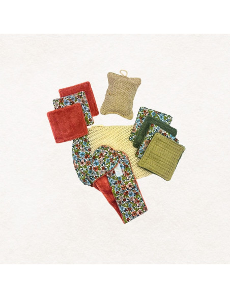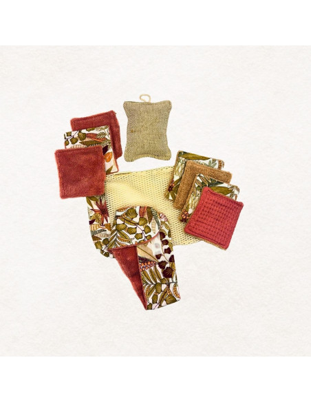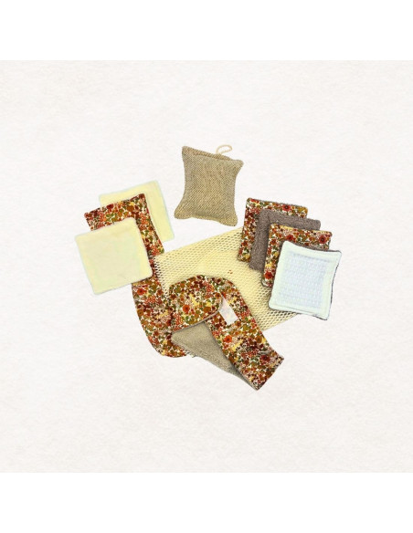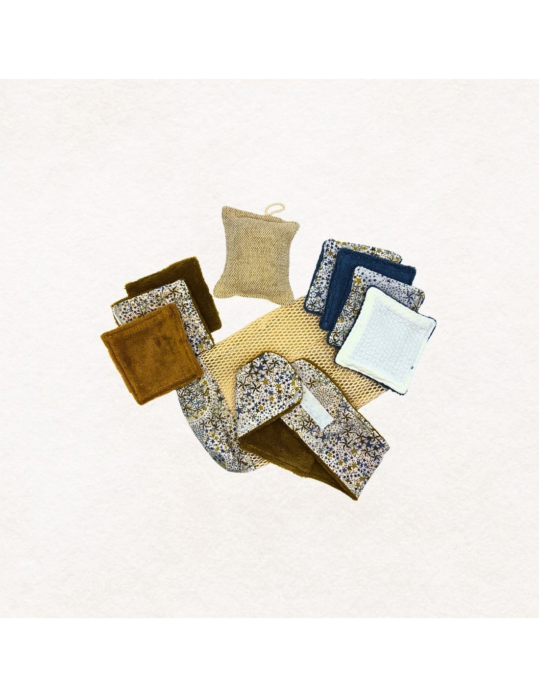 Il réunit sept lingettes démaquillantes cousues à la main en Corse, un bandeau ultra-doux, une éponge de douche moelleuse et un filet de lavage pour un rituel complet, durable et confortable.