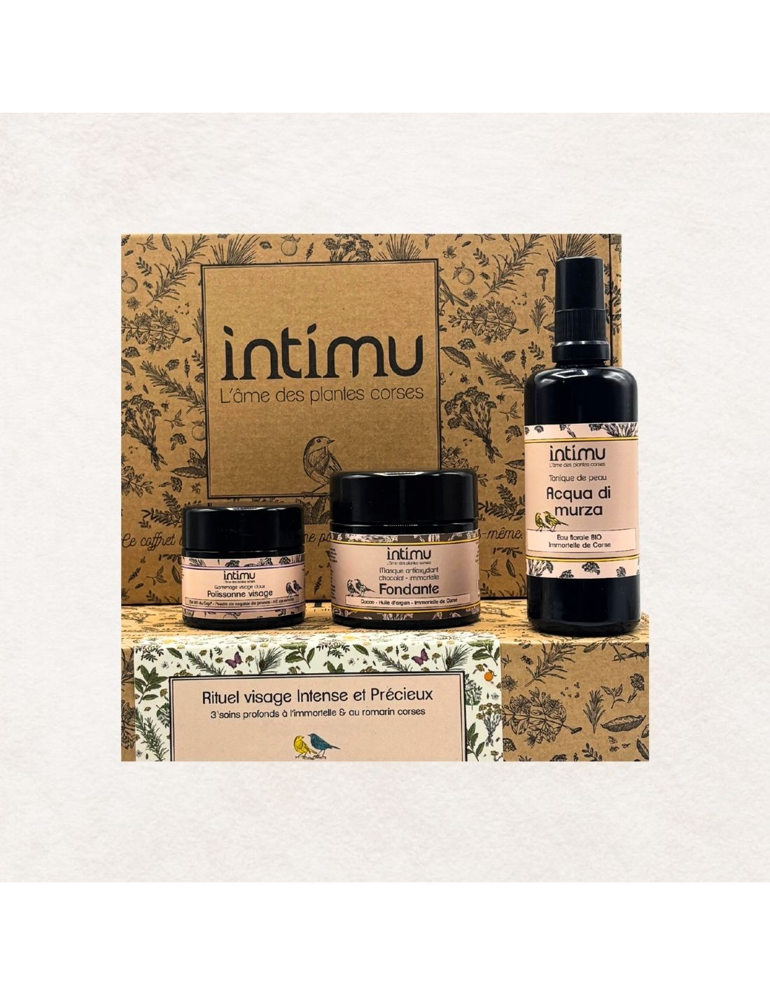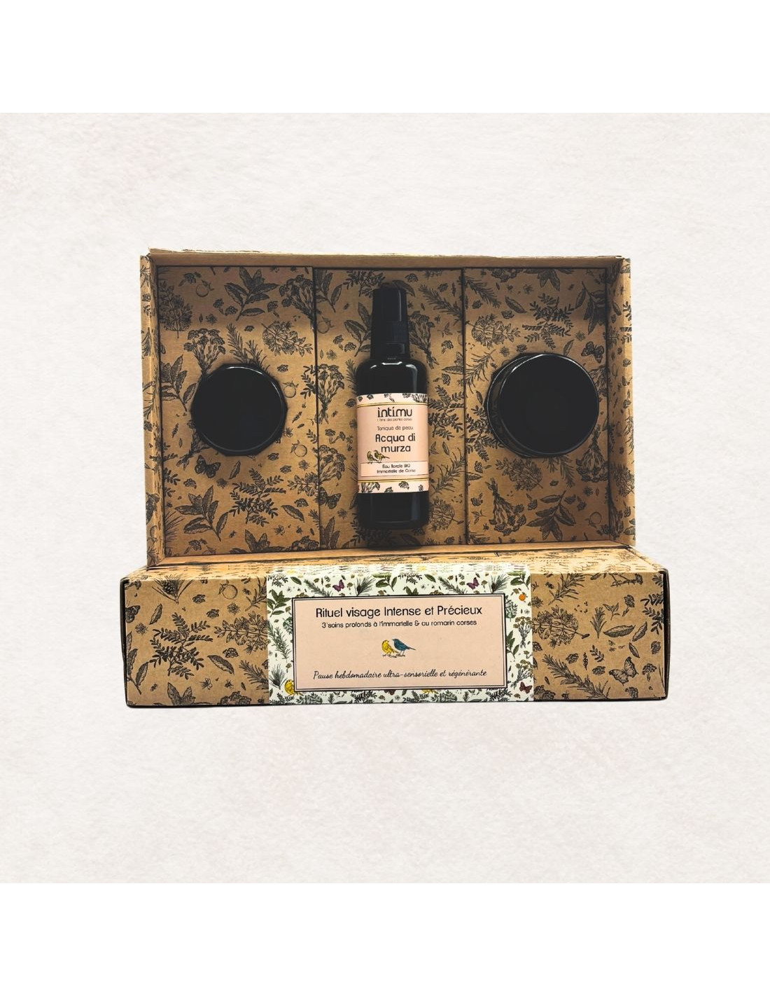 Ce coffret réunit trois soins sensoriels — eau florale d’immortelle, gommage Polissonne et masque Fondante ou Généreuse — pour purifier, nourrir et illuminer naturellement le visage.
