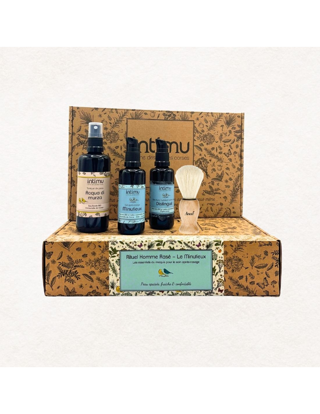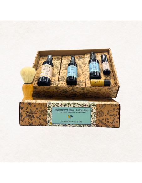Composition : Eau florale BIO de laurier noble 100 ml + Distingué 50 ml + Minutieux 50 ml + Blaireau artisanal offert