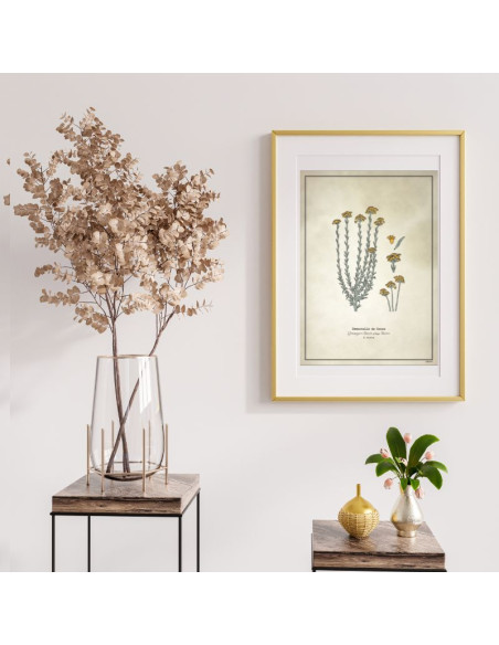 Disposez le bouquet d’immortelles séchées dans une pièce pour prolonger la présence du maquis et encadrez l’affiche botanique pour célébrer sa beauté éternelle.