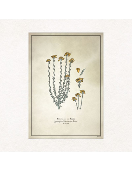 Affiche botanique A5 – Immortelle – une création poétique et solaire à encadrer, célébrant la fleur emblématique de la Corse.