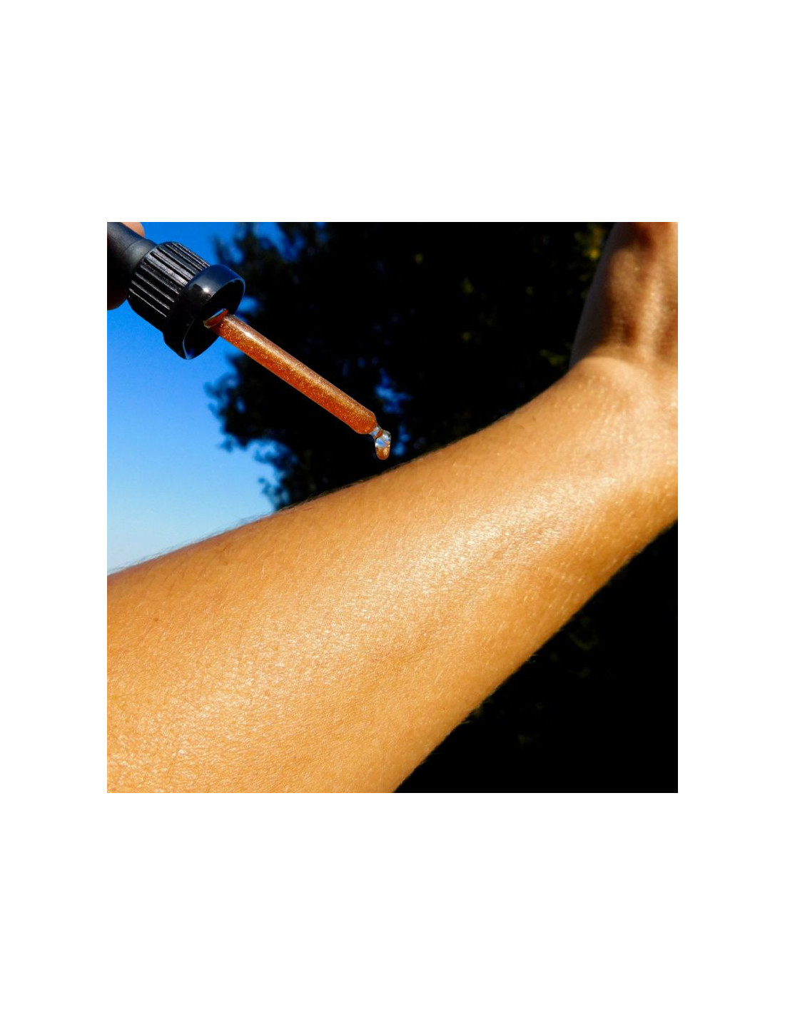 Pour le corps, massez délicatement l’huile Sublime sur peau légèrement humide pour nourrir, raffermir et prolonger le parfum solaire de l’immortelle.