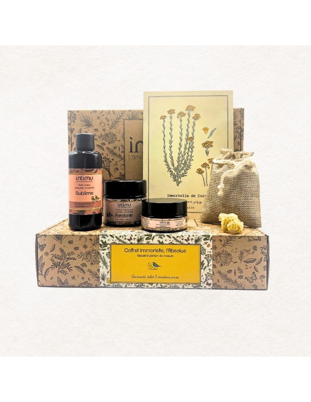 Composition : Gelée Généreuse 50 ml, Huile Sublime 100 ml, Masque Fondante 50 ml, Eau florale d’immortelle 100 ml, Sachet senteur d’immortelle, Quelques brins d'immortelle séchée, Affiche botanique A5.