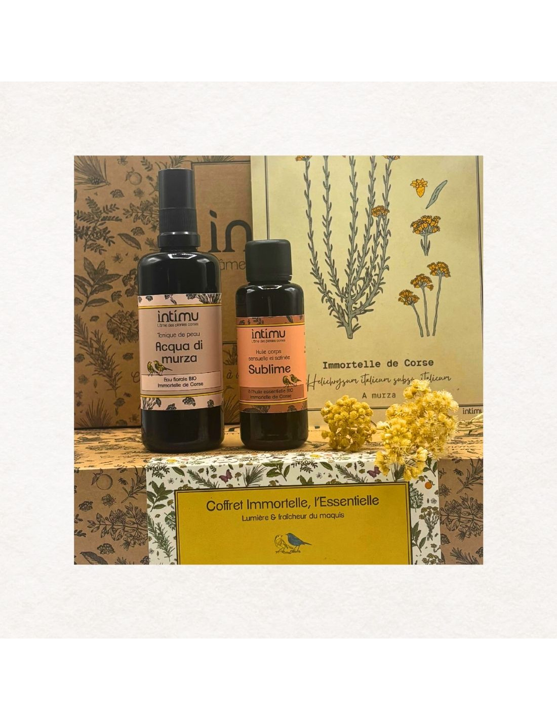 Il associe l’huile corps Sublime, l’eau florale BIO d’immortelle, une affiche botanique et quelques brins de fleurs séchées pour nourrir la peau, éveiller les sens et inviter la lumière du maquis dans votre quotidien.